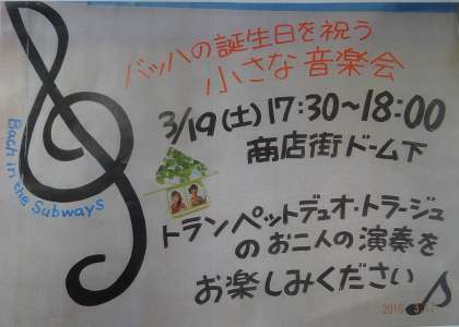 「バッハの誕生日を祝う小さな音楽会」として、3/19(土)17:30〜18:00に商店街ドーム下で、トランペットデュオ・トラージュのお二人の演奏があるそうです。身近な音楽イベントですので、時間があれば鑑賞してみてはどうですか。