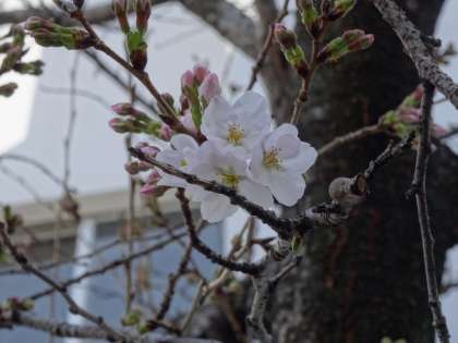講堂横の桜の花がほころび出し、いくつかの花がきれいに咲き出しました。大阪の開花予想は25日ぐらいだったそうですが、ひと足早い開花です。