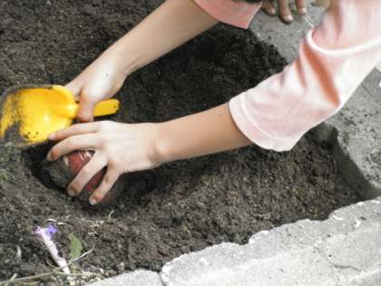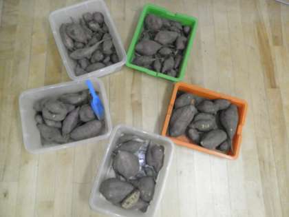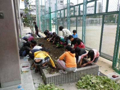 2年生の学習園のサツマイモの葉の色もあせ始めた10月29日(火)、サツマイモ掘りをしました。土の中から現れる幼虫やミミズに驚きながら、掘り進めると「わーっおきい〜!!」「こっちも!」とたくさんのサツマイモが収穫されました。にっこにこの笑顔も大収穫です。