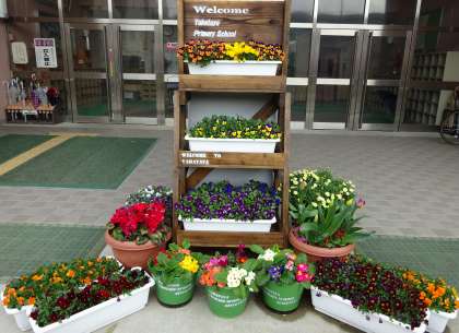 下段:正門前の花壇も色とりどりのきれいな花が咲いています。