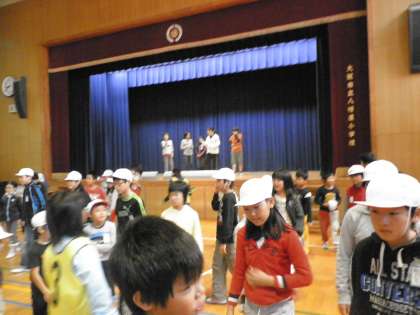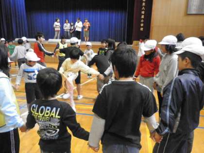毎週水曜日の朝、児童集会が行われます。異学年交流を目的に集会委員が遊びの内容を考えたり、司会や運営をしたりして、仲よく遊びます。