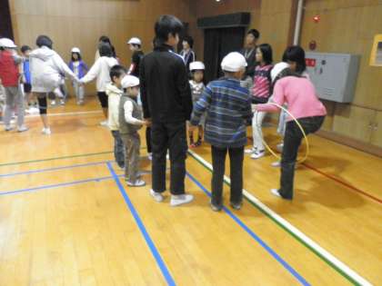 今日の遊びは「フラフープをくぐれ」でした。縦割りグループで手をつないで輪になり、協力しながら手をはなさずに全員がフラフープをくぐり抜けたら成功です。