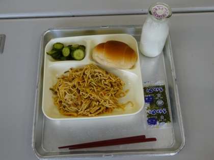 上段:今日のメニューは、焼きそば、きゅうりのしょうがづけ、パン、牛乳です。