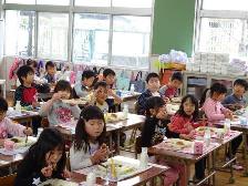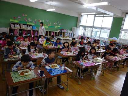 1年生にとって初めての給食。6年生や入り込みの先生の助けで、今日は食べるだけでした。いすにちゃんと座って、落ち着いて食べていました。明日は、「入学祝献立」のカツカレーです。楽しみですね。