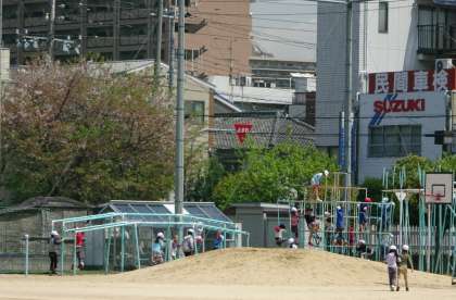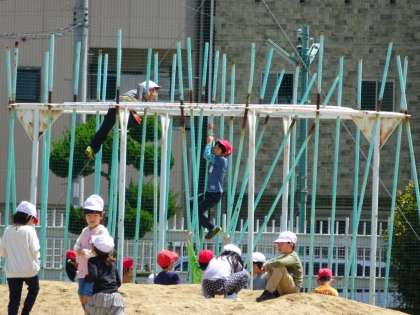 上・中段:日差しが暖かく、1・2年生は運動場の遊具のところで遊んでいました。