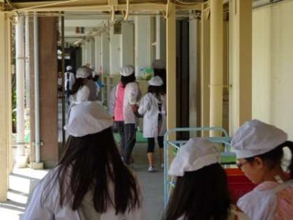 下段:6年生の児童が、1年生のために毎日給食を運んでくれています。