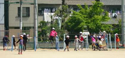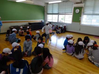 毎週水曜日、2・3時間目の間の休み時間に、キッズチームでたてわり遊びをしています。今日、早速第1回目のキッズタイム。リーダーが下級生をリードして運動場・講堂・教室に分かれて活動しました。