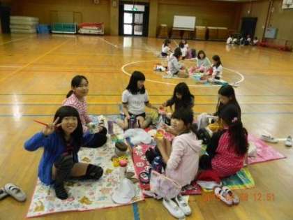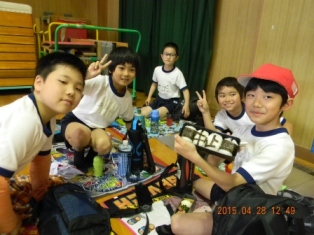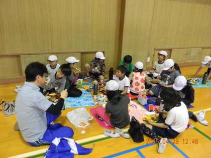今日の鶴見緑地への遠足は、雷注意報と雨のため、5月10日(火)に延期になりました。遠足の気分を少しでも味わうために講堂でお弁当を食べ、遊びました。