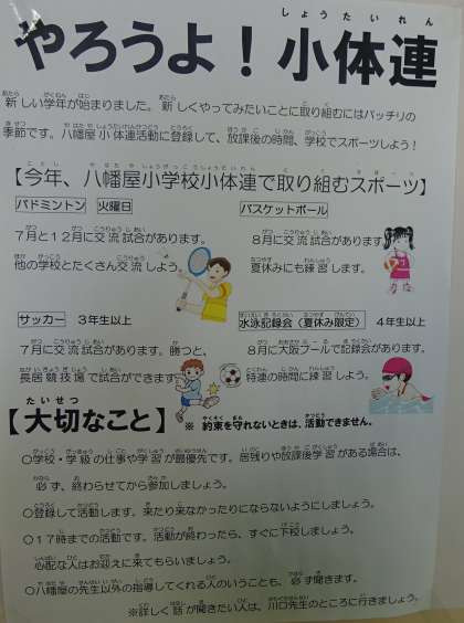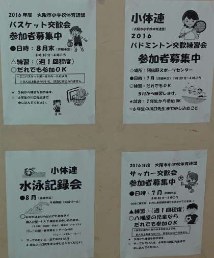 中・下段:児童朝会で連絡があったように、小体連活動の募集ポスターが玄関に貼られています。申込書も玄関に置いています。参加を希望する人は、申し込んでください。