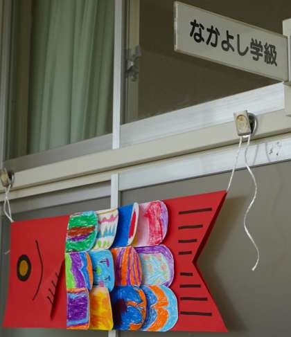 中段:なかよし学級に飾られているこいのぼり。もう1つは青いこいのぼり。児童が作りました。