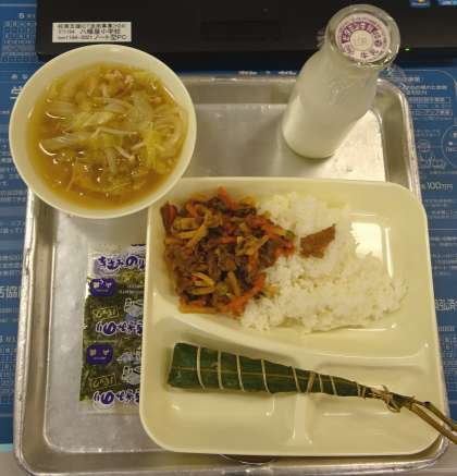 下段:「子どもの日の行事献立」は、牛肉のちらしずし、すまし汁、ちまき、牛乳です。