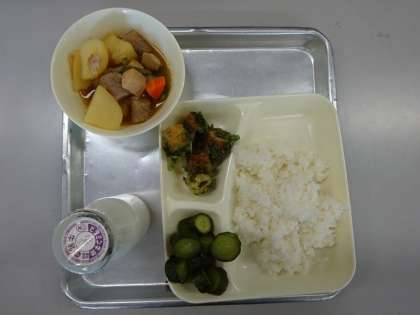 下段:二日目の給食は、ちくわのいそべあげ、鶏肉とじゃがいもの煮もの、あっさりきゅうり、ごはん、牛乳です。中学校の給食と比べてどうですか?