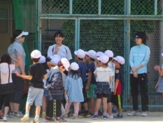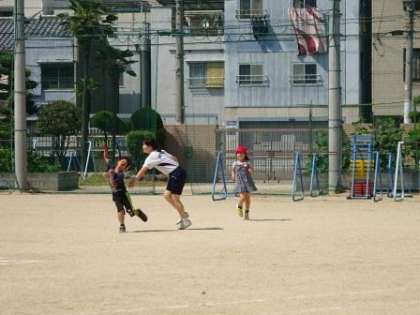 気温が高い中、小学生と遊ぶ中学生は元気です。かなり疲れていたようですが。