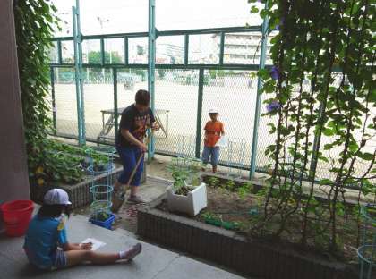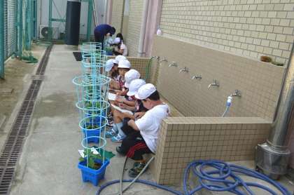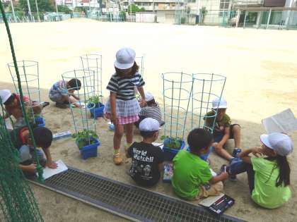 1年生が植えたアサガオもだいぶ育ってきました。今日は自分が水やりをしてきたアサガオの観察です。これからさらにツルを伸ばしていって、花を咲かせます。