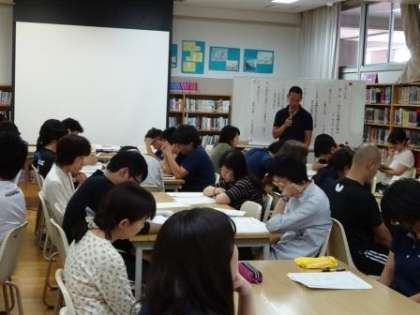 港中学校・池島小学校・八幡屋小学校の教員が港小学校に集まり、第1回三校合同教職員研修会が開かれました。
