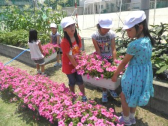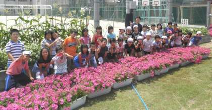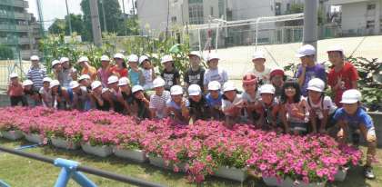 5/13に3年生が植えたサフィニアマックスが大きな花をつけてきましたので、記念写真を撮りました。この花は、サントリーフラワーズから寄贈していただいたものです。管理作業員さんが整備した、正門の花壇にも大きくきれいな花を咲かせています。