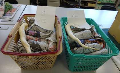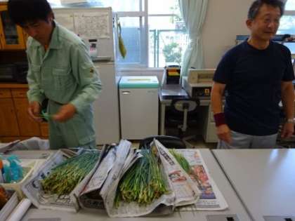 今日は、大根とねぎがとれました。大根は、管理作業員さんと先生が切り分けて新聞紙に包み、4・5年生児童が家に持って帰りました。