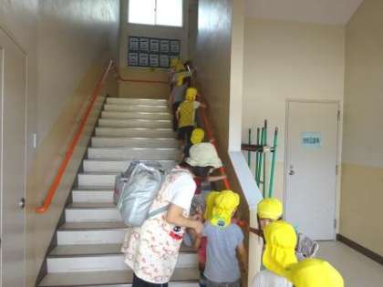 本校の近くにある八幡屋保育所が避難訓練で来校し、屋上プールまで避難しました。