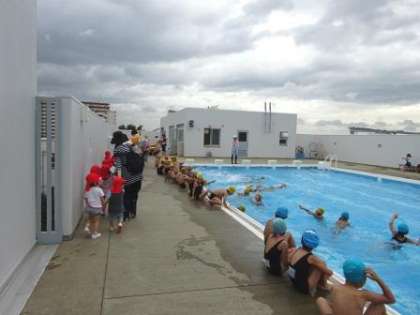 中段:屋上プールに着くと、小学1・2年生の水泳の授業でした。知り合いのお兄ちゃんお姉ちゃんがいて喜んでいました。