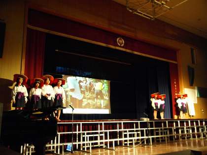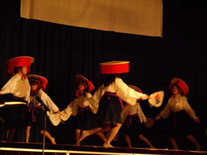 みんな命を「いただいて」生きている。「いただいた」命に感謝する。をテーマに学年が「お米」チーム、「お魚」チーム、「お肉」チームの3つに分かれ、スライドショーを使った発表を行いました。そして、それに関連した芸能を披露しました。