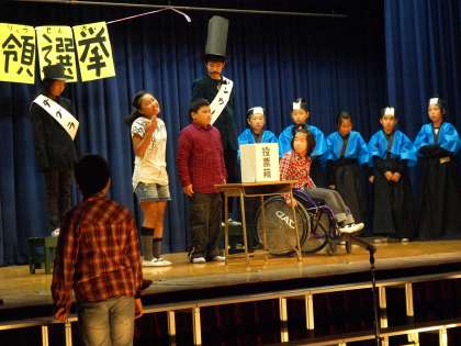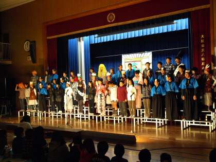 下 全員で歌う「地球星歌」その歌声の素晴らしさ、またたくさんの大切なメ ッセージのこもった6年生の劇に感動し、学習発表会は幕を閉じました。