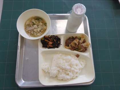 上段:献立コンクールに入選したメニューです。牛肉と野菜のいためもの、かきたま汁、枝豆入りひじき、ご飯、牛乳。