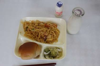 シーフードスパゲティ、グリーンサラダ、はっ酵乳、パン、牛乳