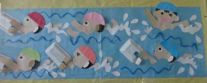 上段:高・中・低学年の順番で屋上プールで泳ぎました。水がぬるくなるほどの暑さで、たくさんの保護者の方は暑かったと思います。