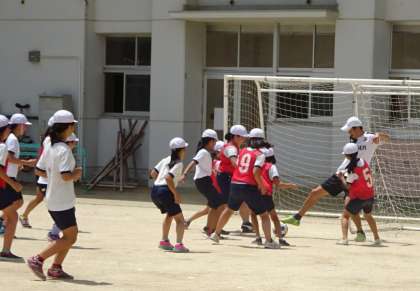男子も女子も物怖じしないでコーチとボールを競い合ったりして、楽しく体を動かしていました。猛暑の中、2時間児童の指導をしていただきありがとうございました。
