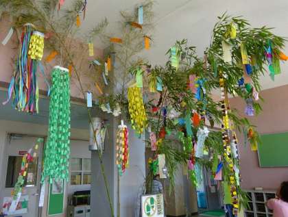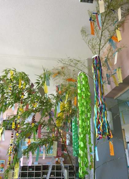 明日の七夕に向けて、笹に自分の願いを書いた短冊をつけました。地域の方からも竹をいただき、大きな笹飾りも貸していただき、豪華な笹になりました。