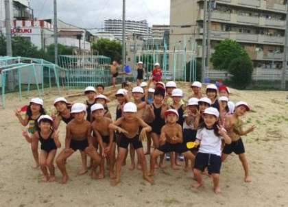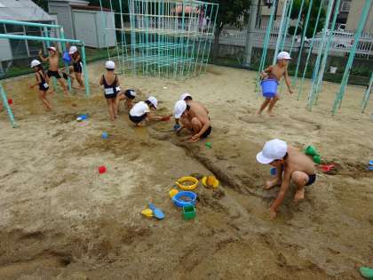 1年生は5時間目に水泳で使った水着にまた着替えました。運動場の端の土山に水を運び、溝を作って流したり、池を作ったりして遊びました。最初はおとなしく遊んでいたのですが、野生化してきて、おたけびをあげながらのどろんこ遊びに変わる児童もいました。