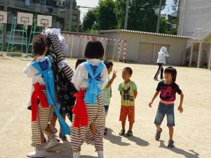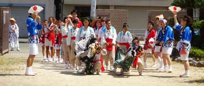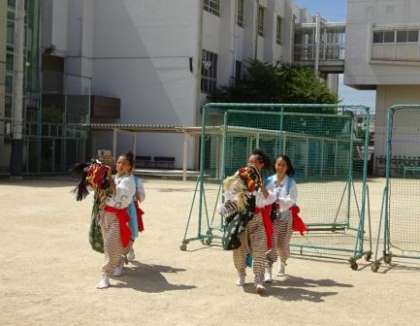 獅子舞も小学校に入ってきて、獅子舞を見せたり、賢くなるように頭を獅子にかんでいただいたりしました。傘踊りも地域に出てくるそうです。