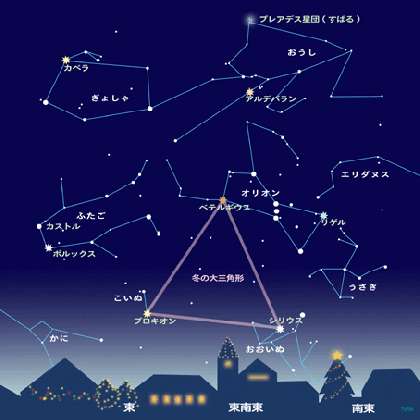 イラストのように、これからの季節、冬空の澄み切った空気(大気)の中で、とても見やすくなります(見える時刻、方角)