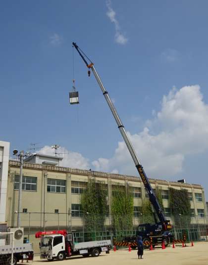 上段:今日の午前中、屋上にクーラーの室外機をクレーンで揚げました。重機を入れての作業は山場を越え、配管・配線等の内工事に入ります。