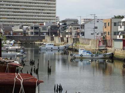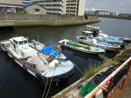 上・中段:校区内には、三十間堀川につながる船置き場があり、漁船が停泊しています。