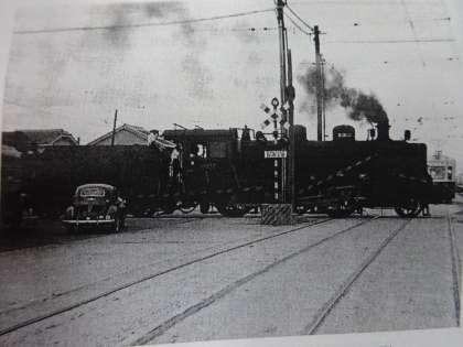上段:千舟橋(港晴2)付近を走る蒸気機関車。向こう側に通過を待っている市電の電車が見えます。