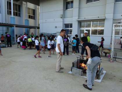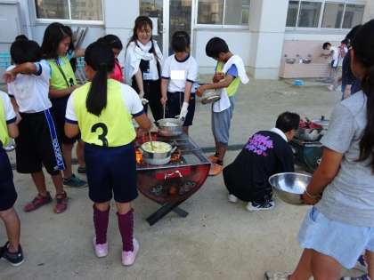 中段:けむりで目が痛いのをがまんして、カレー作り。
