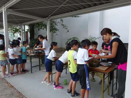遊んだ後は、夕食のカレー作りに挑戦。野菜の皮をむいて、小さく切って準備をしました。