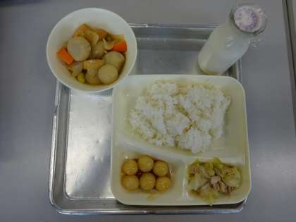 今年は9月15日(木)が「十五夜」(中秋の名月)になります。収穫の時期ですので、「芋名月」とも呼ばれるそうです。少し早いですが、今日の給食は、月見の行事献立でした。みたらしだんご、さといもがメニューに出ていました。