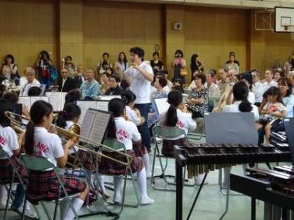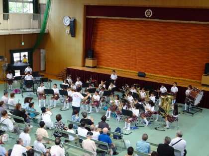 挨拶の後、港中学校の吹奏楽部の演奏があり、中学生らしい迫力ある演奏をしてくれました。続いてキッズバンド八幡屋の演奏。短時間で仕上げた「川の流れのように」を含む4曲の演奏。「レイダースマーチ」「ふるさと」「川の流れのように」「銀河鉄道999」をしっかり演奏しました。
