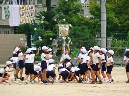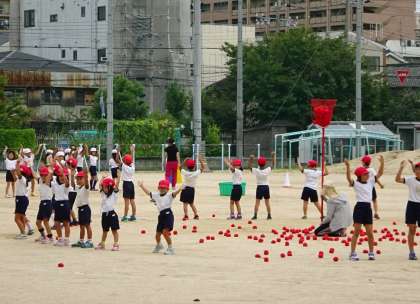 上段:音楽に合わせてダンスをしていて、曲が止まると玉入れです。