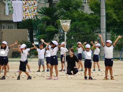 中段:昨日から教育実習として来ているH先生も玉入れを手伝っています。2年1組に入っています。