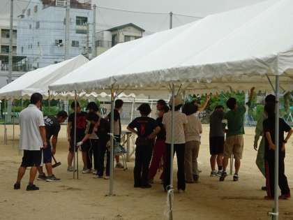 職員でテント張りをしました。途中で雨が降ってきたので、本部前の4つのテントだけになりました。児童用テントは、金曜か土曜に設置する予定です。
