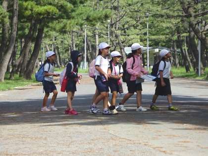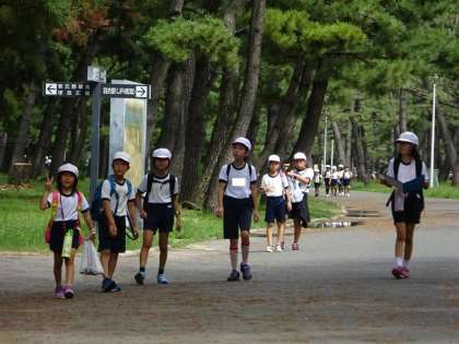 遊んだ後は、3・4年のたて割り班でオリエンテーリング。どの班も、木にあるシールをすべて見つけてゴールしました。
