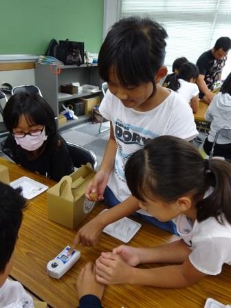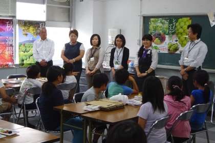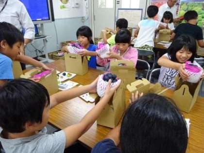 ブドウや果物、山梨県について学習をした後、JAグループ山梨からいただいたぶどうの箱詰め作業やぶどうの味比べや糖度の測定などの学習をしました。おみやげのぶどうもいただき、ありがとうございました。