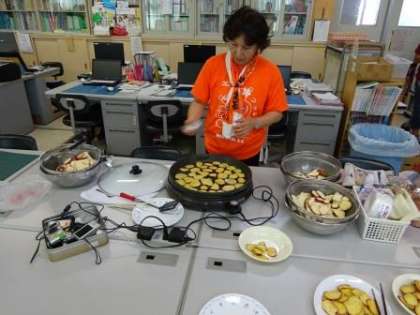 飼育栽培委員会で収穫したさつまいもを委員会担当の先生と保健室の先生が調理して、給食の時に、飼育栽培委員会が配達し、全学年の児童にふるまわれました。バターの香りがして、おいしかったです。