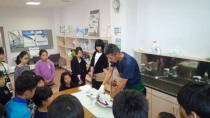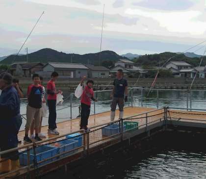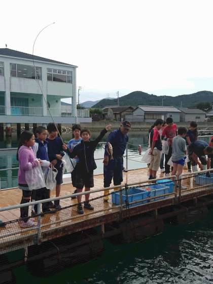 香川県の養殖漁業についての学習です。鯛釣り体験とハマチの解体見学・試食です。