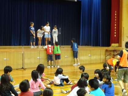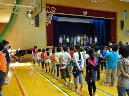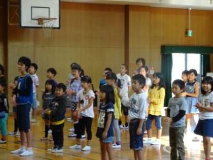 集会委員会がことばクイズをした後、今月の歌2曲を全員で合唱しました。「大きな歌」と「だれにだっておたんじょうび」の2曲です。「だれにだっておたんじょうび」は創立記念日バージョン(きょうは ヤハタヤがっこうの おたんじょうび)です。