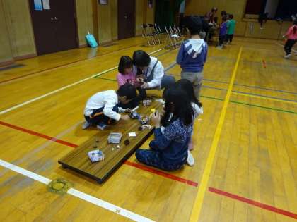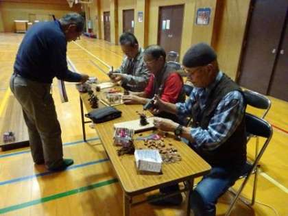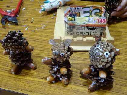 休憩の後、今度は松ぼっくりを使った工作をしました。子どもたちは一生懸命やっていましたが、最後の仕上げは、講師の方々にしていただきました。午後1時過ぎまで残ってやっていただきました。遅くまでありがとうございました。