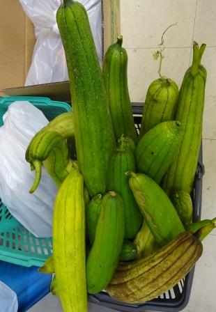 大きなへちまがとれました。水につけて皮をとって身体をゴシゴシ洗うスポンジになります。